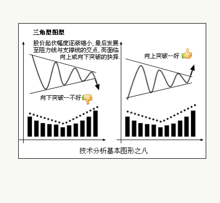 又称棋型图形。股价起伏幅度逐渐缩小,最后发展至阻力线与支撑线的交点,而面临向上或向下突破的抉择。若为向上突破,在配合高成交量,则股价将奔荣途。反之,若为向下突破,成交量又有增无减,则股价已呈岌岌可危势。