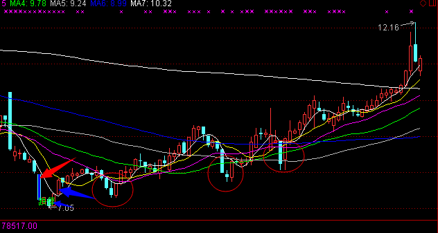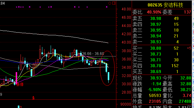 3)不能补仓的股票形态:连续阴线+跌破所有均线,比如:安洁科技(002635);